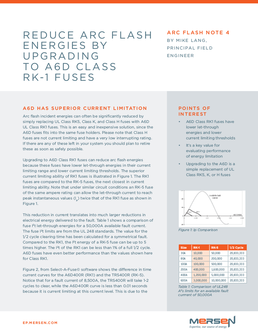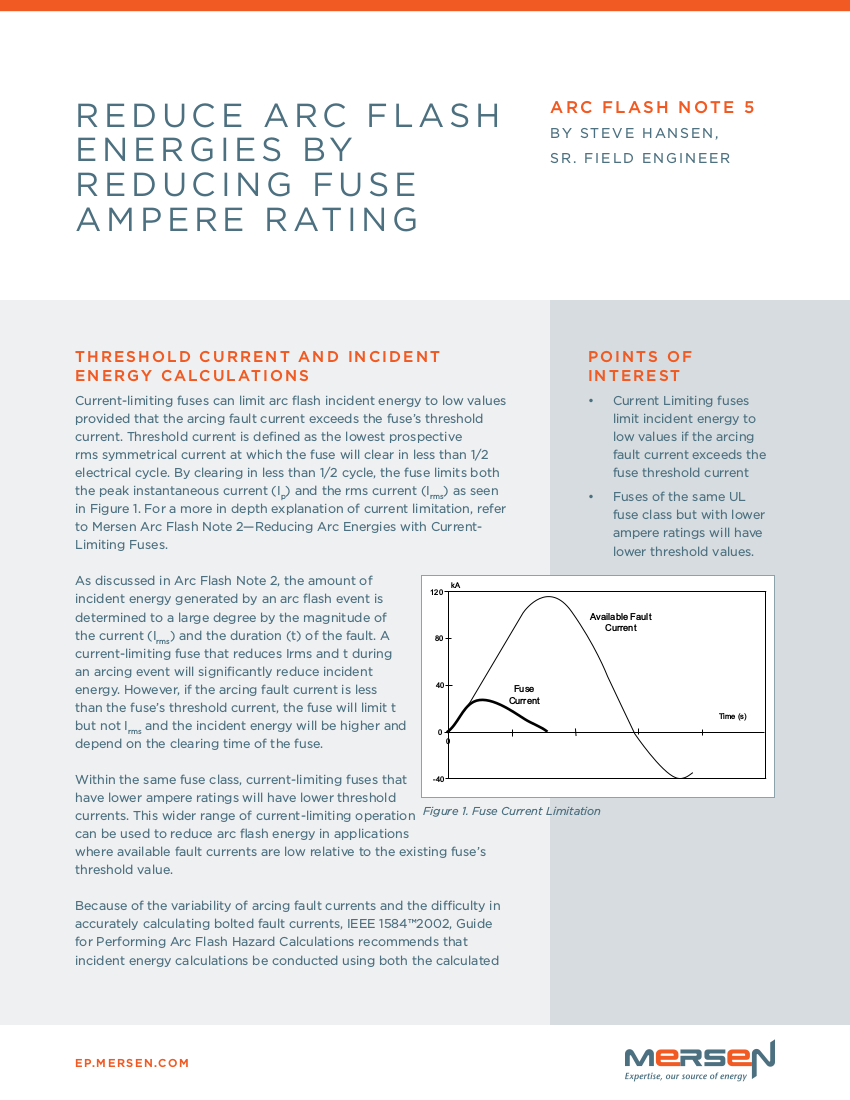 To see how well these fuses limit incident energy, use our calculator. To discuss how Mersen fuses can help reduce arc flash hazards in your facility, email us or call our Technical Services department.