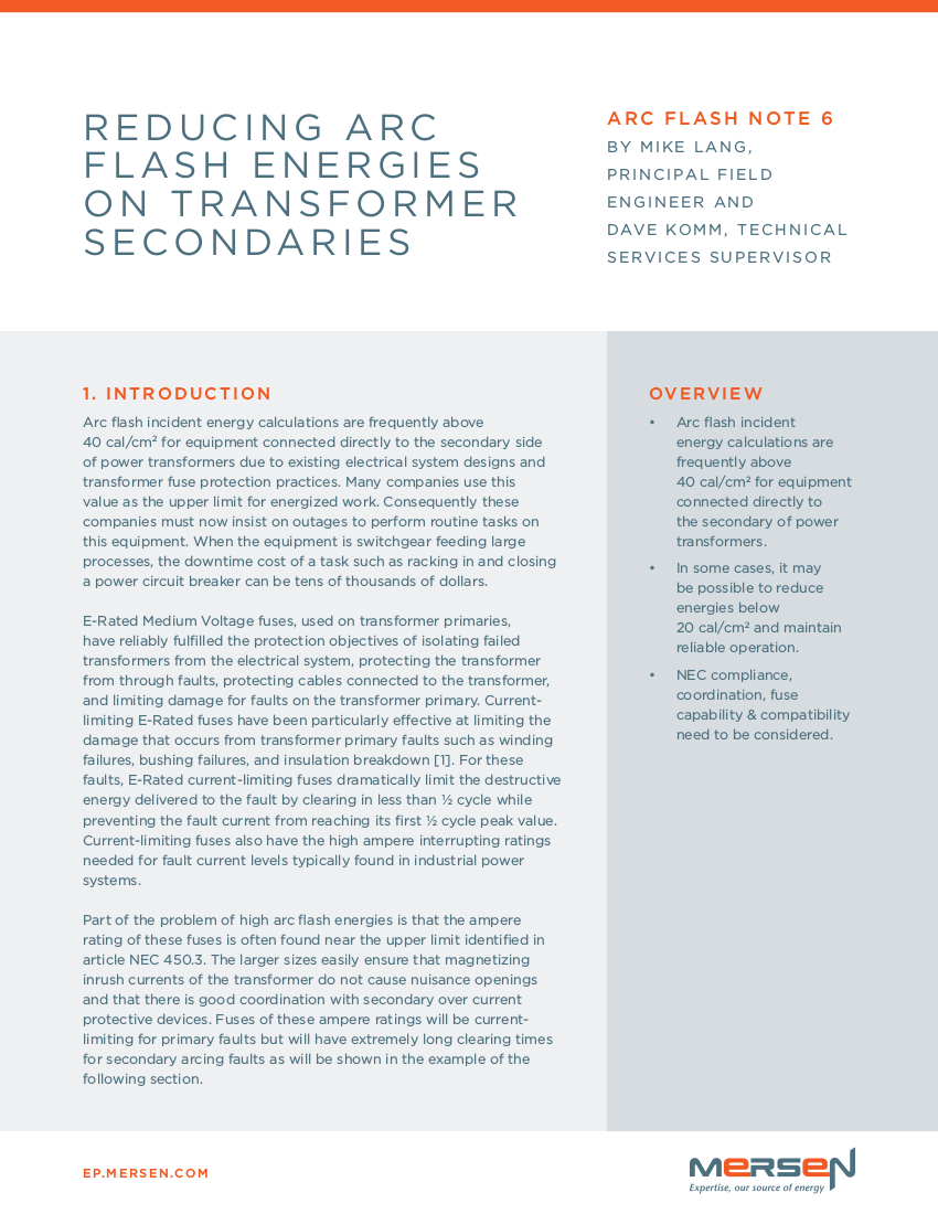Arc flash incident energy calculations are frequently above 40 cal/cm2 for equipment connected directly to the secondary side of power transformers due to existing electrical system designs and transformer fuse protection practices. Many companies use this value as the upper limit for energized work. Consequently these companies must now insist on outages to perform routine tasks on this equipment. When the equipment is switchgear feeding large processes, the downtime cost of a task such as racking in and closing a power circuit breaker can be tens of thousands of dollars In some cases, it is possible to reduce energies below 20 cal/cm2 and maintain reliable operation by using a fuse with different time current characteristics.